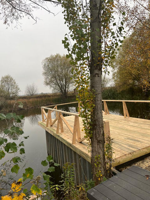 Staw z pomostem znajdujący się naprzeciwko gwarantuje cudowny widok zachodzącego słońca, którego nie przesłonią kolejne budynki.